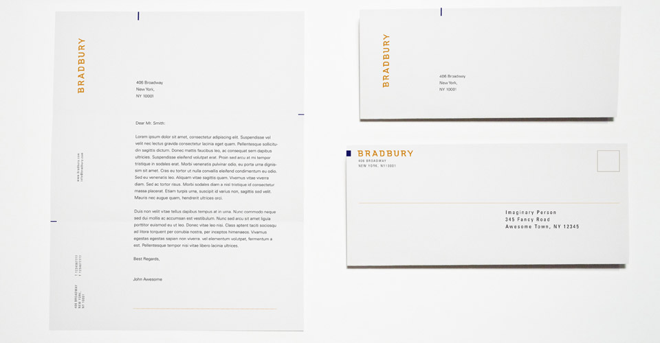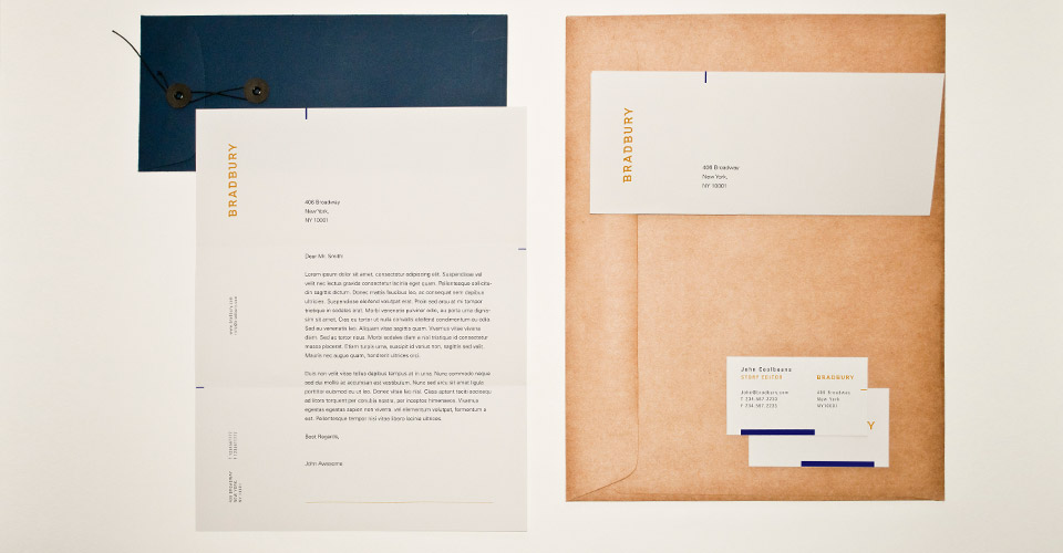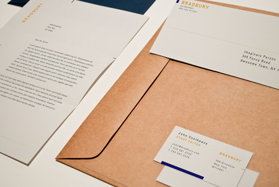 Bradbury was a company created for one of my typography classes. Bradbury was a publishing company that would provide children's literature from classics to more modern titles in an interactive ebook form available for iPads, e-readers, other tablets and computers. The images in this section focus on stationary application of the logo: letterhead, business card, envelope.