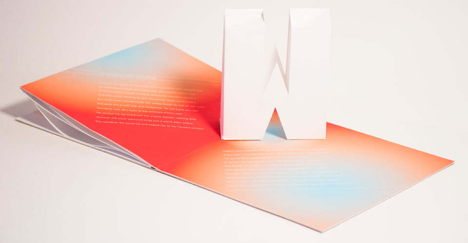 "W" Book was a project designed for a class with prof. Keith Godard. Each of the students was assigned a letter, and had to create a book about it that included history of the given letter. At the end of the book was a required pop-up of the letter as well as a short story/poem for children.